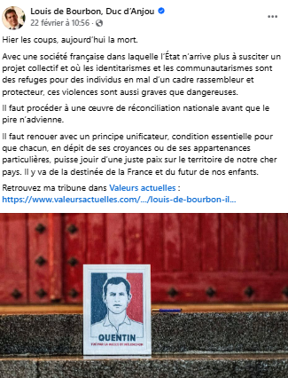 Aujourd’hui, nous commémorons l’assassinat de mon ancêtre Louis XVI, décapité le 21 janvier 1793. Il ne s’agit en réalité pas que de faire mémoire de ce roi injustement décapité. Il faut également se souvenir ensemble de ce que les Français ont été capables de faire entre eux afin de tout faire pour ne plus jamais sombrer dans la tragédie de la guerre civile. Puisse le Ciel ne jamais permettre à la France de revivre de tels événements.