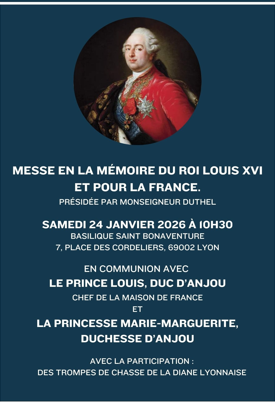 Au cours de cette Messe, nous aurons donc à cœur de confier le Roi Louis XVI et sa famille au Seigneur, de prier pour que les jeunes générations soient les dignes héritiers de notre histoire qu’ils ont le droit de connaître ; nous prierons aussi pour tout le peuple de France et ses dirigeants, tour particulièrement pour les plus pauvres de notre société, tous ceux qui sont l’objet de violence et d’atteinte à leur dignité fondamentale.