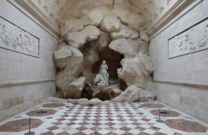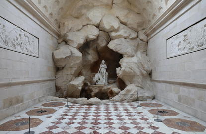 Louis XVI n’a pourtant pas lésiné sur les moyens. Sur les murs, blancs de lait, des tableaux mettent en lumière la vie agricole, si chère à l’esprit des Lumières. Au centre, une table permet de déguster beurre, crème et fromages. Et le spectacle ne s’arrête pas là. Au fond de la pièce, une lourde porte dissimule la salle de repos où trône, majestueuse, une grotte artificielle, parcourue de fontaines où le lait était mis à rafraîchir. Si ces splendeurs n’ont pas su adoucir le cœur de Marie-Antoinette, elles ont conquis l’impératrice Joséphine quelques années plus tard. « Regardez attentivement le fronton », invite Laurent Mortier. Après le « L » de l’article, une minuscule apostrophe se détache dans la pierre. Elle n’a pas été redorée. « A l’envers de la plaque, Joséphine avait fait graver son rang. » Il y a donc eu une « Laiterie de l’impératrice ».