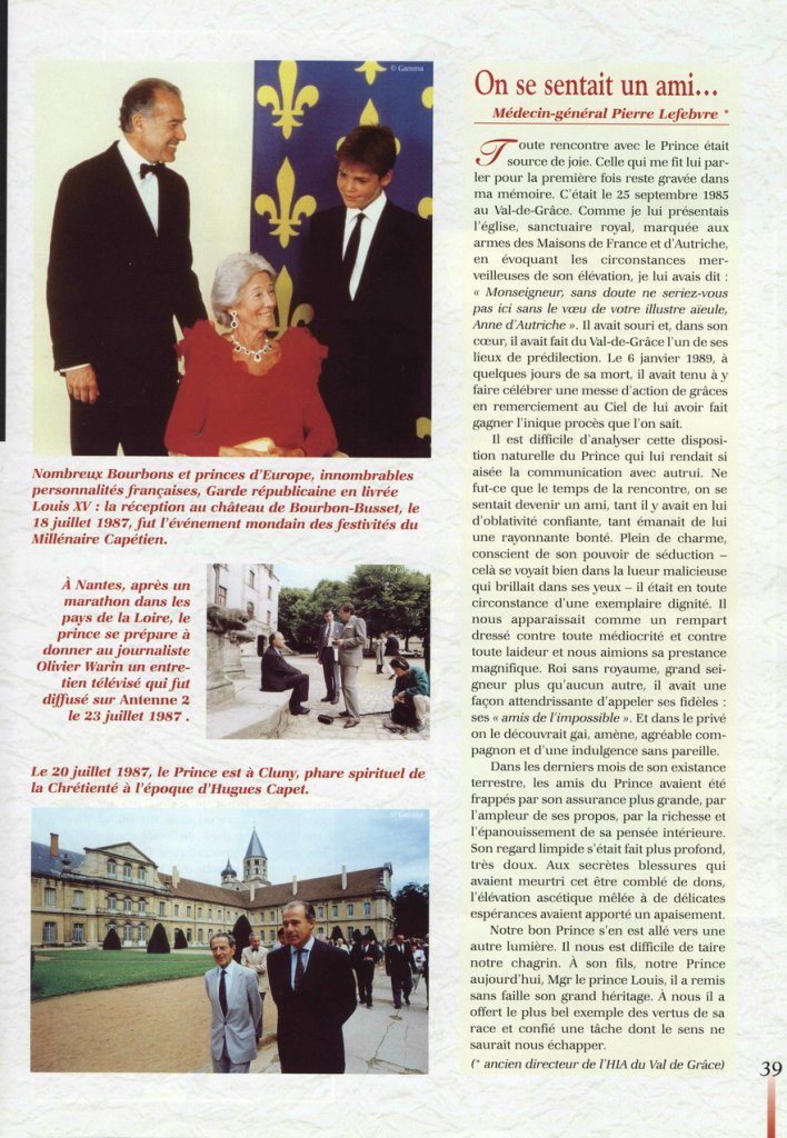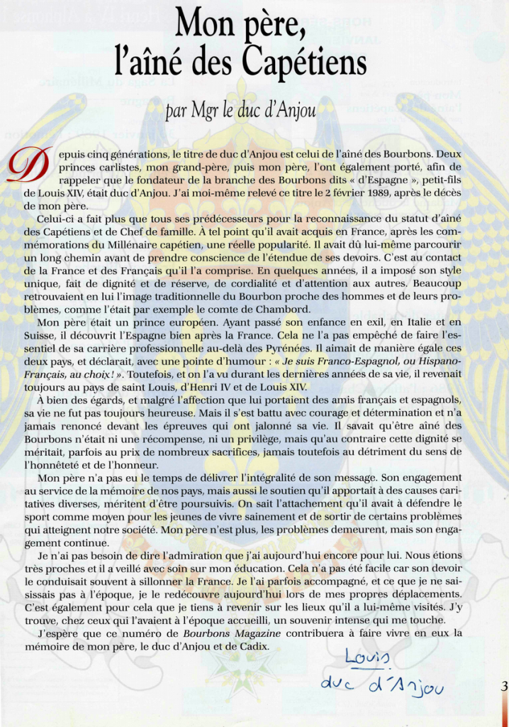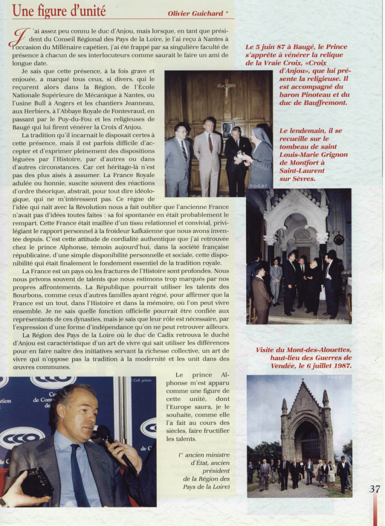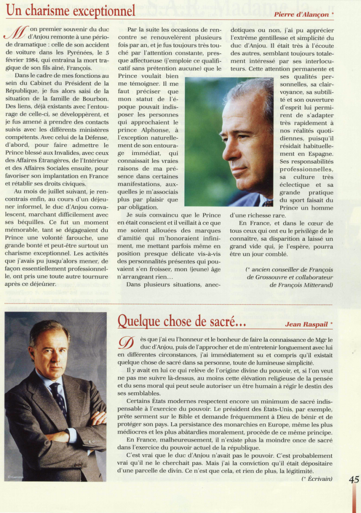 « Dès que j’ai eu l’honneur et le bonheur de faire la connaissance de Mgr le duc d’Anjou, puis de l’approcher et de m’entretenir longuement avec lui en différentes circonstances, j’ai immédiatement su et compris qu’il existait quelque chose de sacré dans sa personne, toute de lumineuse simplicité.