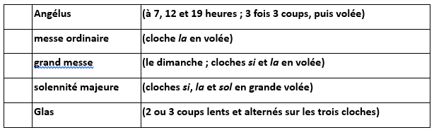 Plusieurs cloches permettent d’avoir des sonneries cultuelles variées correspondant aux différentes cérémonies et au Temps liturgique (Temps ordinaire, Temps de Pénitence – Avent, Carême – Temps pascal…). Le nombre de cloches mises en volée varie selon le degré de solennité.