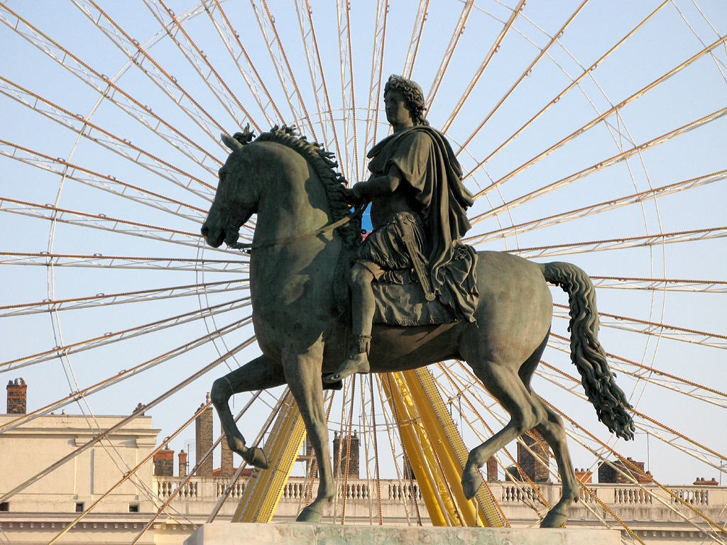 La statue de Louis XIV arriva à Lyon en 1701 et ne fut installée Place Bellecour qu’en 1713, créée par Martin Desjardins, elle disparut à la Révolution (1793) afin d’être fondue pour en faire des canons.